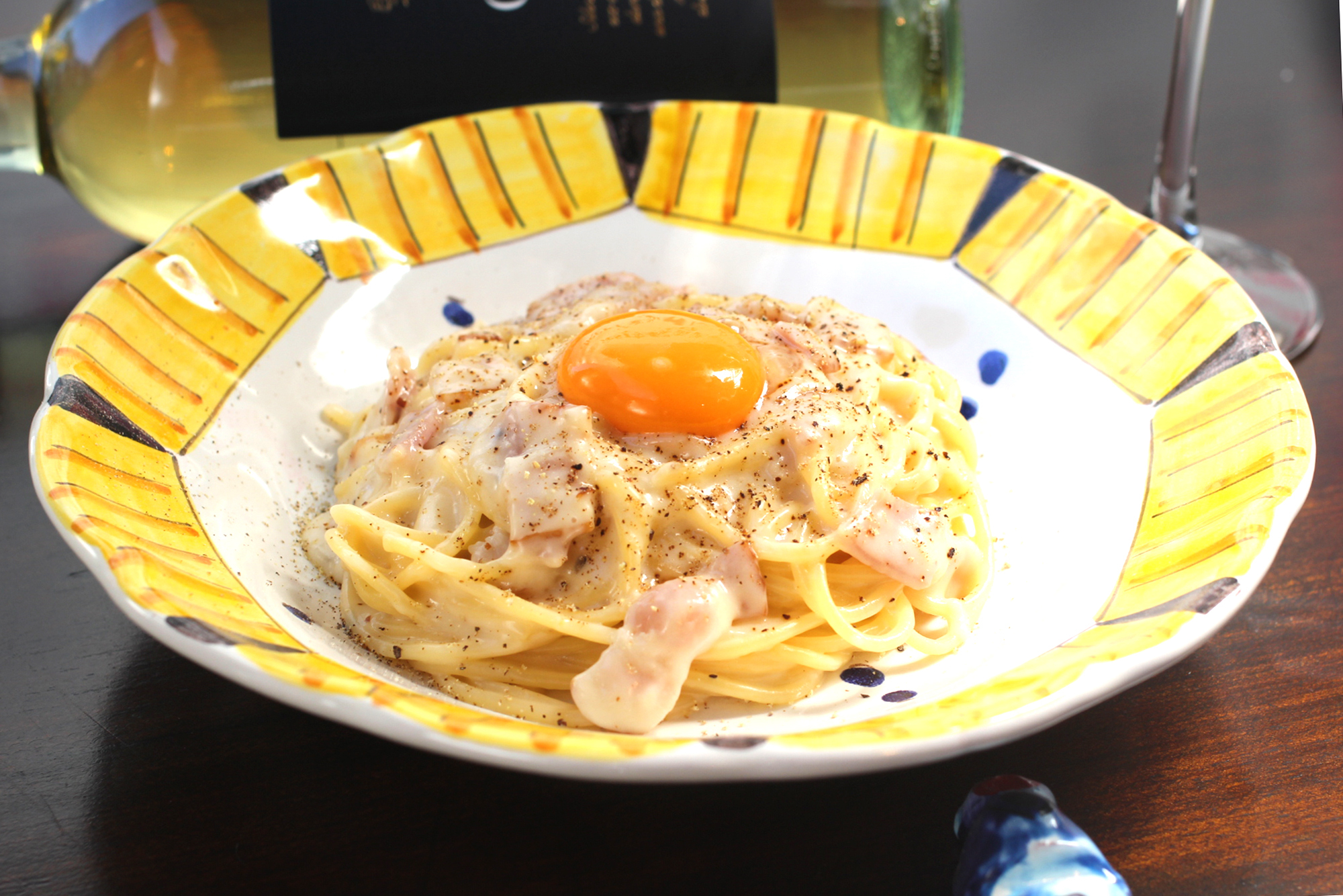卵黄を加えて仕上げるチーズたっぷりカルボナーラ