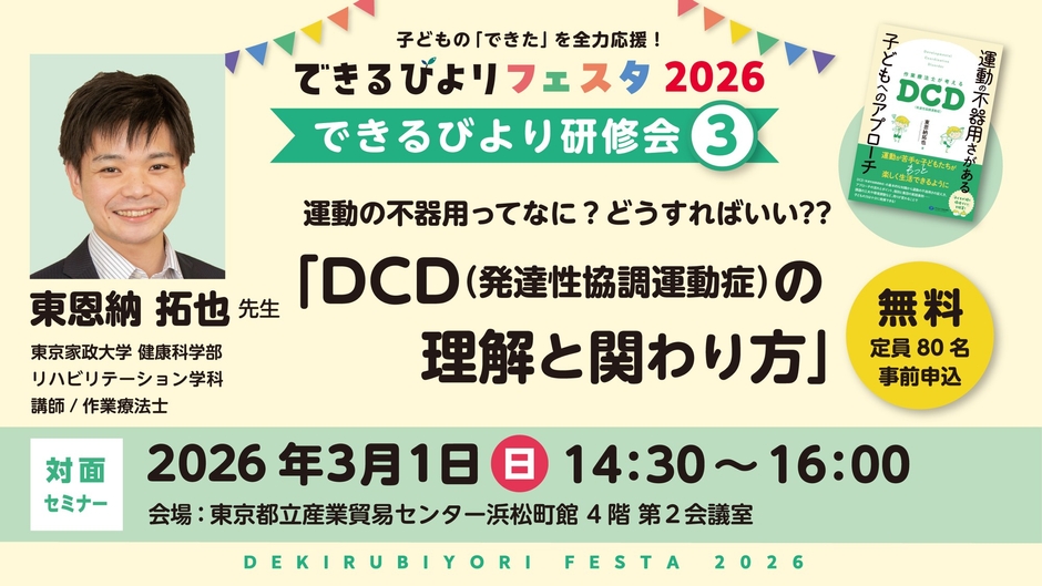 「DCD(発達性運動協調症)」は学齢期の子どもの約5〜6%に見られるとされる神経発達症です。さらに、DCDの診断には該当しないものの、運動協調性に何らかの課題を抱える子どもを含めると割合は高くなると言われています。では、運動が苦手な子どもは全員DCDなのでしょうか?本セミナーでは、DCDへの正しい理解とその具体的な支援法について学びます。