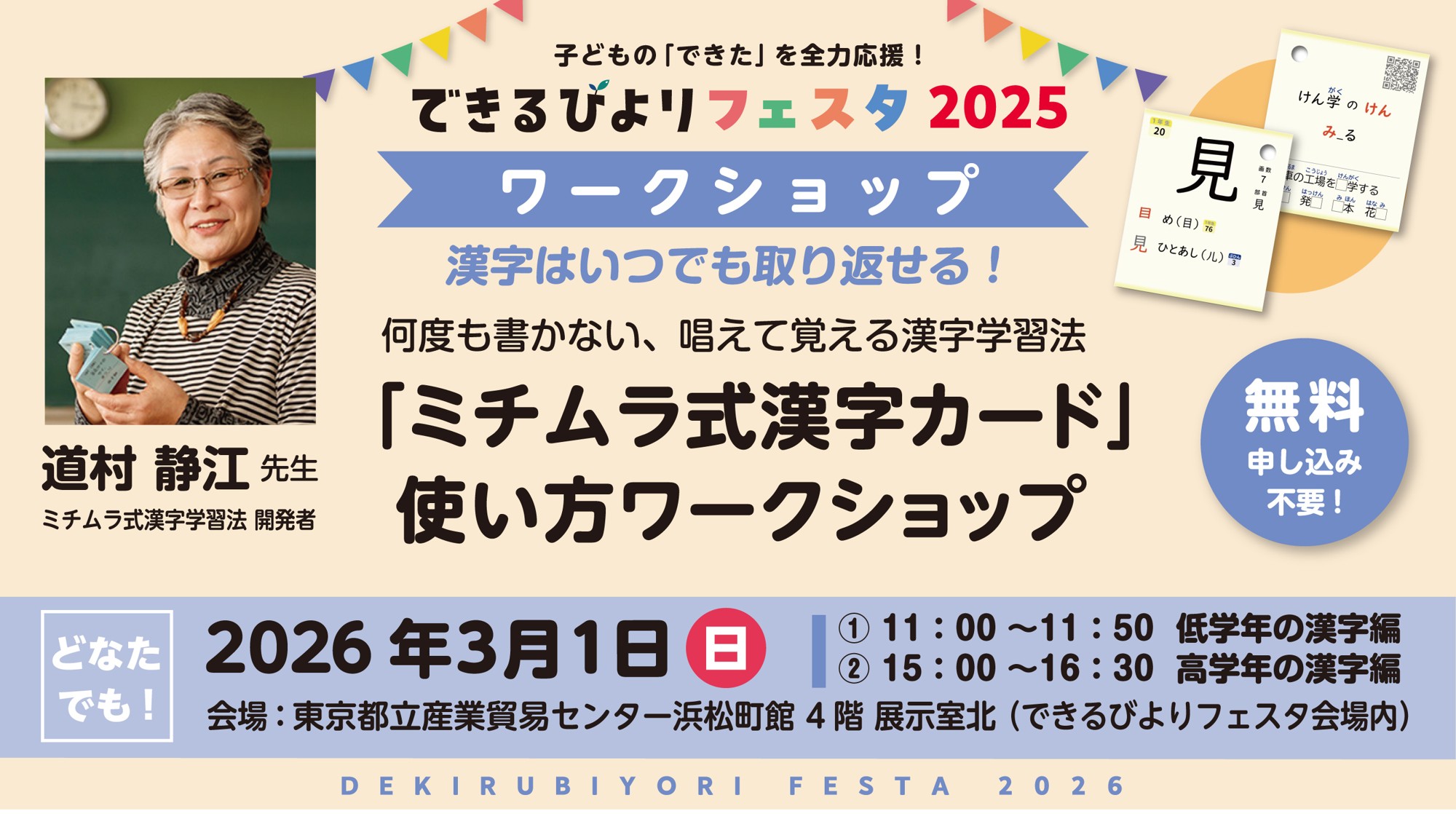 書かずに唱えて覚える漢字学習法「ミチムラ式漢字学習法」の開発者・道村静江先生による「ミチムラ式漢字カード」の使い方ワークショップです。