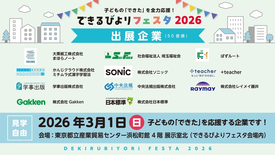 子ども学習支援教材を展開する【できるびより】(株式会社オフィスサニー:東京・荒川区/代表取締役・高橋淳一)が、2026年3月1日(日)に東京・浜松町で【できるびよりフェスタ2026】を開催します。入場無料・来場予約不要で自由に参加できるイベントです。