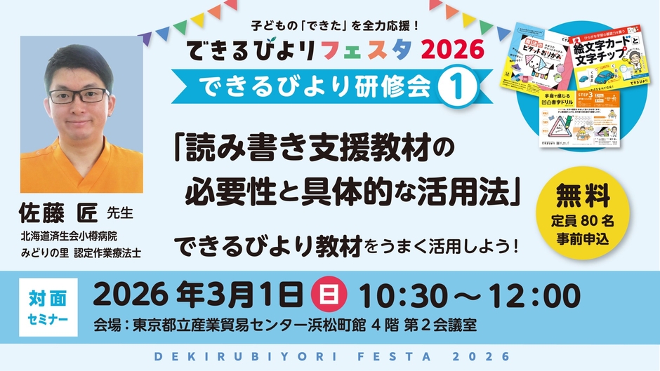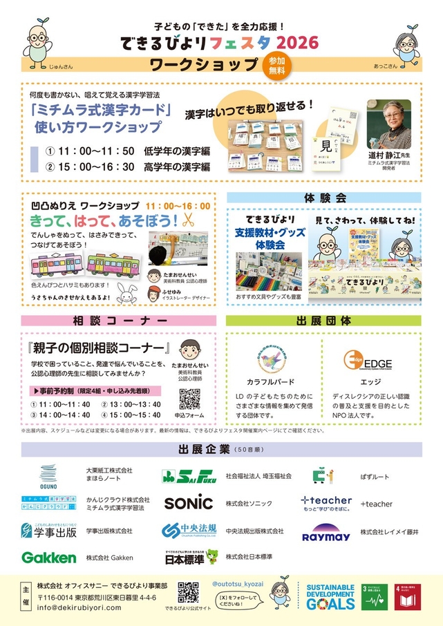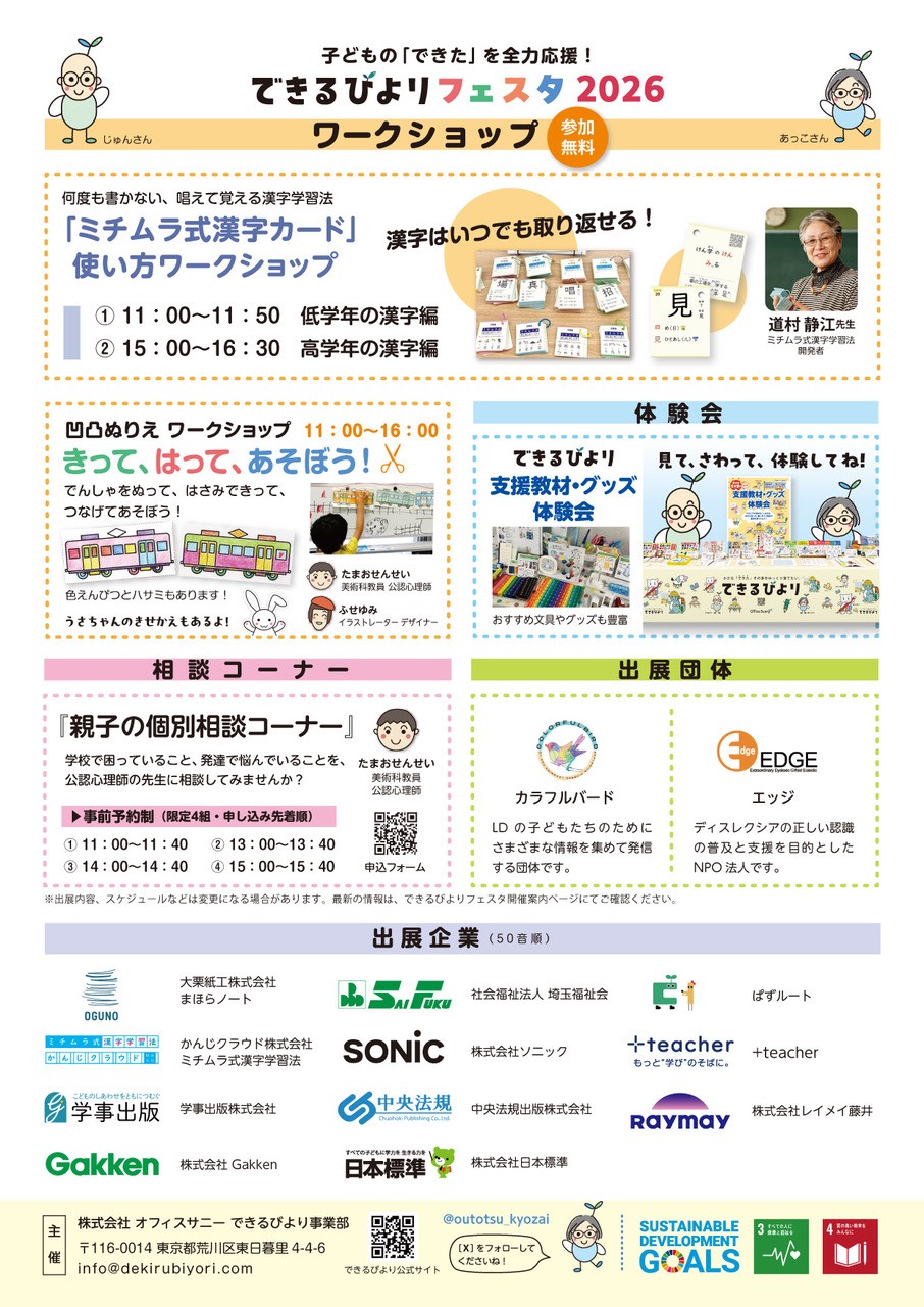 いよいよ今週末開催!<入場無料>気になる学習支援グッズを見てさわって体験できるイベント【できるびよりフェスタ2026】を開催します!漢字が苦手な子向けのワークショップも大人気!親子での参加はもちろん、学校の先生、保育・療育の先生もぜひご来場ください!