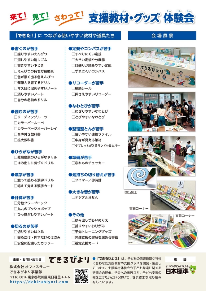 【できるびより】は、子どもの「できた!」を全力で応援する教材・教具の開発製造、子どもの発達支援に関する情報発信などの活動をしています。全国で開催している『できるびより支援教材・グッズ体験会』は開催70回を超えました。