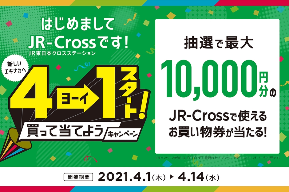 『4→1(ヨーイ)スタート 買って当てようキャンペーン』は、2021年4月1日から14日までの14日間、JR-Crossの運営する22店舗の商業施設、約1,400店の飲食店及び物販店舗、約8,700台の飲料自動販売機等、合計約10,000店舗でJRE POINTが貯まるお買い物をすると、抽選で合計300名様にJR-Crossお買い物券(最大10,000円)が当たります。