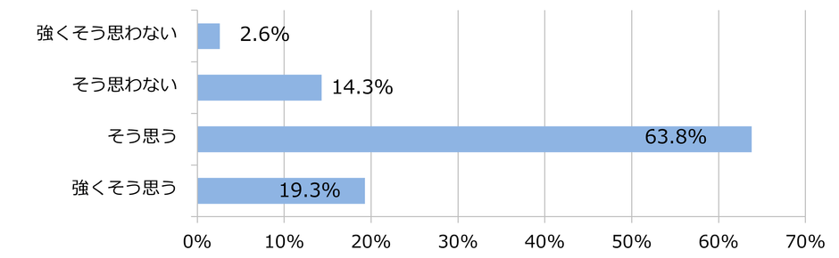- 「周囲と比べて自分は交通ルールを守っており自転車の安全運転ができている」かの設問に対して「強くそう思う」と「そう思う」の回答の合計は83.1%であった。(図1)