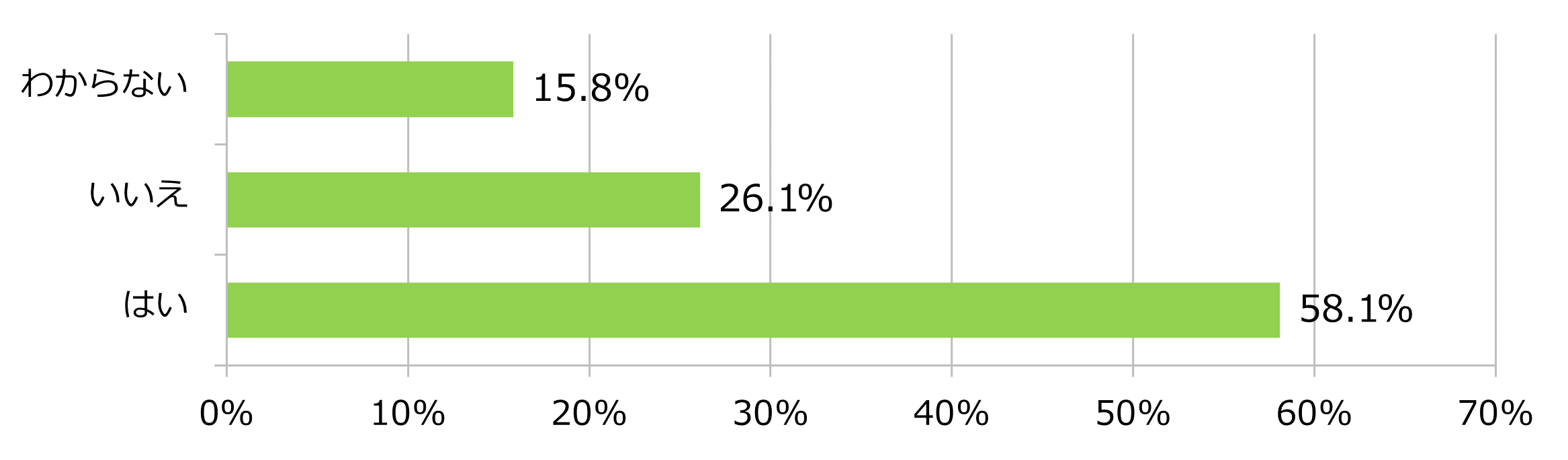 - 回答者の自転車損害賠償保険加入の認識については、58.1%が加入している、26.1%が加入していない、15.8%がわからないと回答した。(図8)