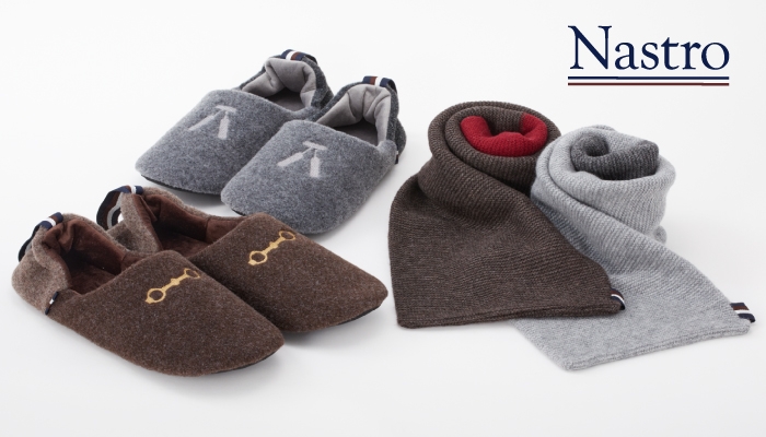 アクセントファッションを得意とするムーンバットから「ミラノリブ マフラー」、リーガルコーポレーションからフットウェアの経験を活かした「ルームシューズ」をローンチ。カラーコーディネートされた組み合わせと、ブランド名の「Nastro(ナストロ:イタリア語で「リボン」の意)」の通り、あしらったストライプのオリジナルリボンがアクセントとなり、日常にもたらす「上質な時間」を表現します。