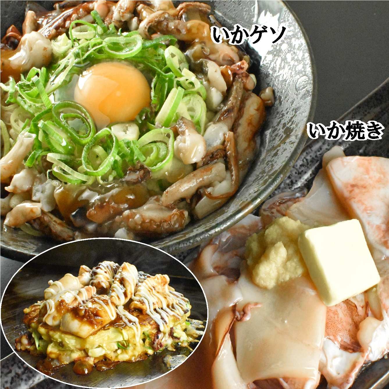 イカの豊かな風味を徹底的に追求したメニューです。バター醤油で仕上げたイカ焼きを贅沢にのせ、お好み焼きの中身にもイカゲソを使用することで、イカの個性を余すことなく引き出す設計となっています。生姜をお好みで加えることで、さらなる味わいの奥行きを演出できます。