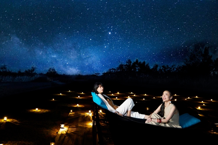 満天の星を眺めるために全長50mの「ティンガーラハンモック」があります。ハンモックに寝転がると、頭上には壮大なティンガーラ。心地よい風を感じながら満天の星を眺め、心落ち着くひと時を過ごせます。「ティンガーラハンモック」のある場所は周りに高い建物がなく、人工光の入らない開けた空が臨める場所です。また、小浜島は「星空保護区」*4に認定され、21個ある1等星の全てと88星座中の84星座を見ることができます。