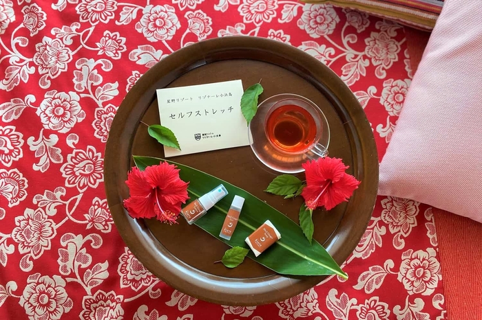 ストレスが溜まる要因のひとつには睡眠不足があると言われています。滞在中にはしっかりと就寝ができるように、ストレッチの指南書とハイビスカスティーを用意します。身体をストレッチでほぐし、日中に焼けた肌を労わるビタミンC豊富なハイビスカスティーでリラックスして、心地よい眠りへと誘います。また、アメニティとして用意したスキンケアセットは、添加物を使用せず、沖縄に馴染み深い月桃を中心に作られており、肌へのストレスを最小限に抑えます。客室で過ごす就寝前のひとときで、上質な睡眠をとることができます。