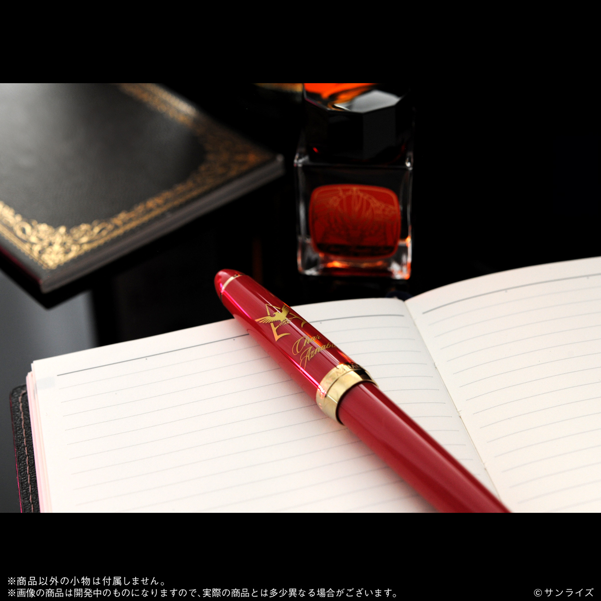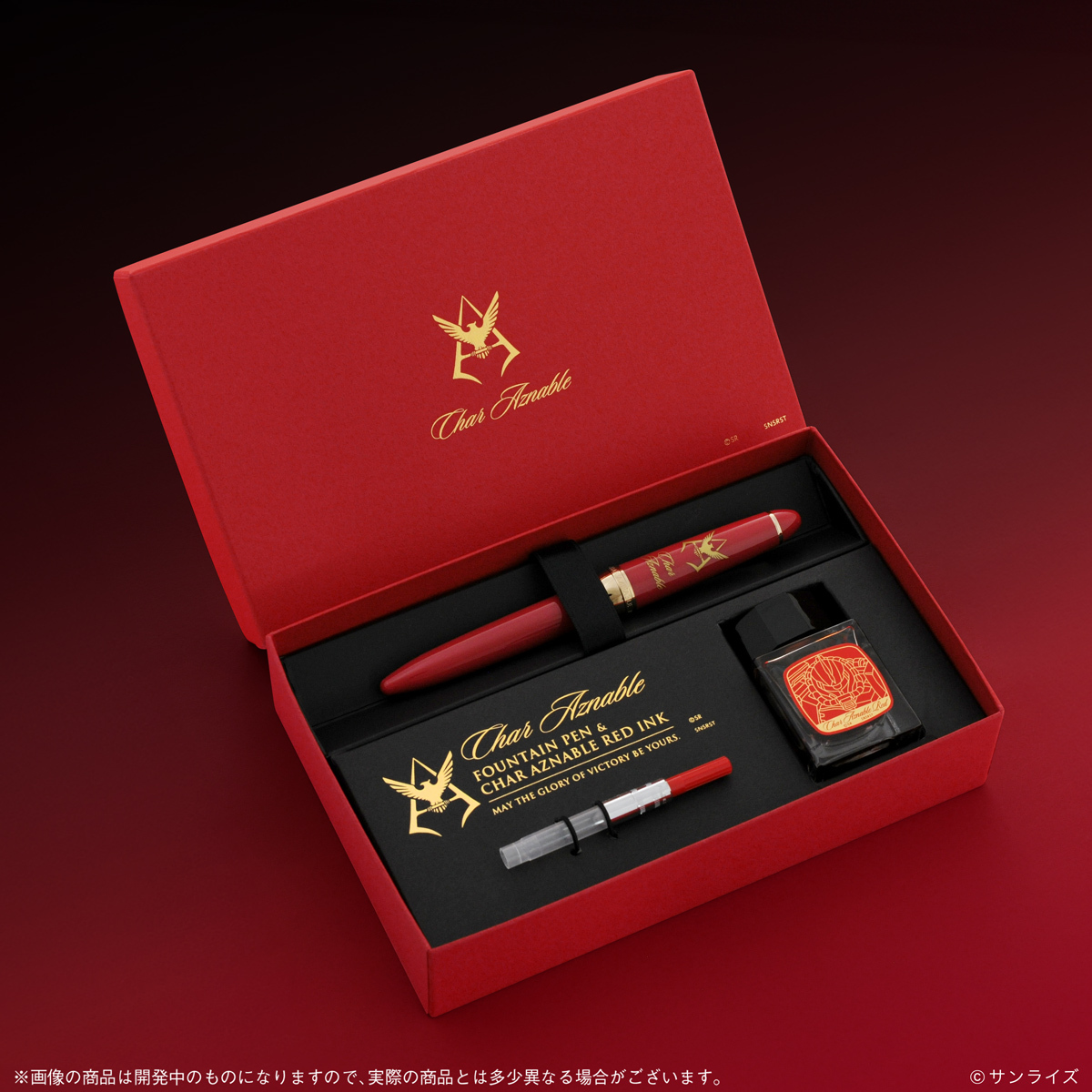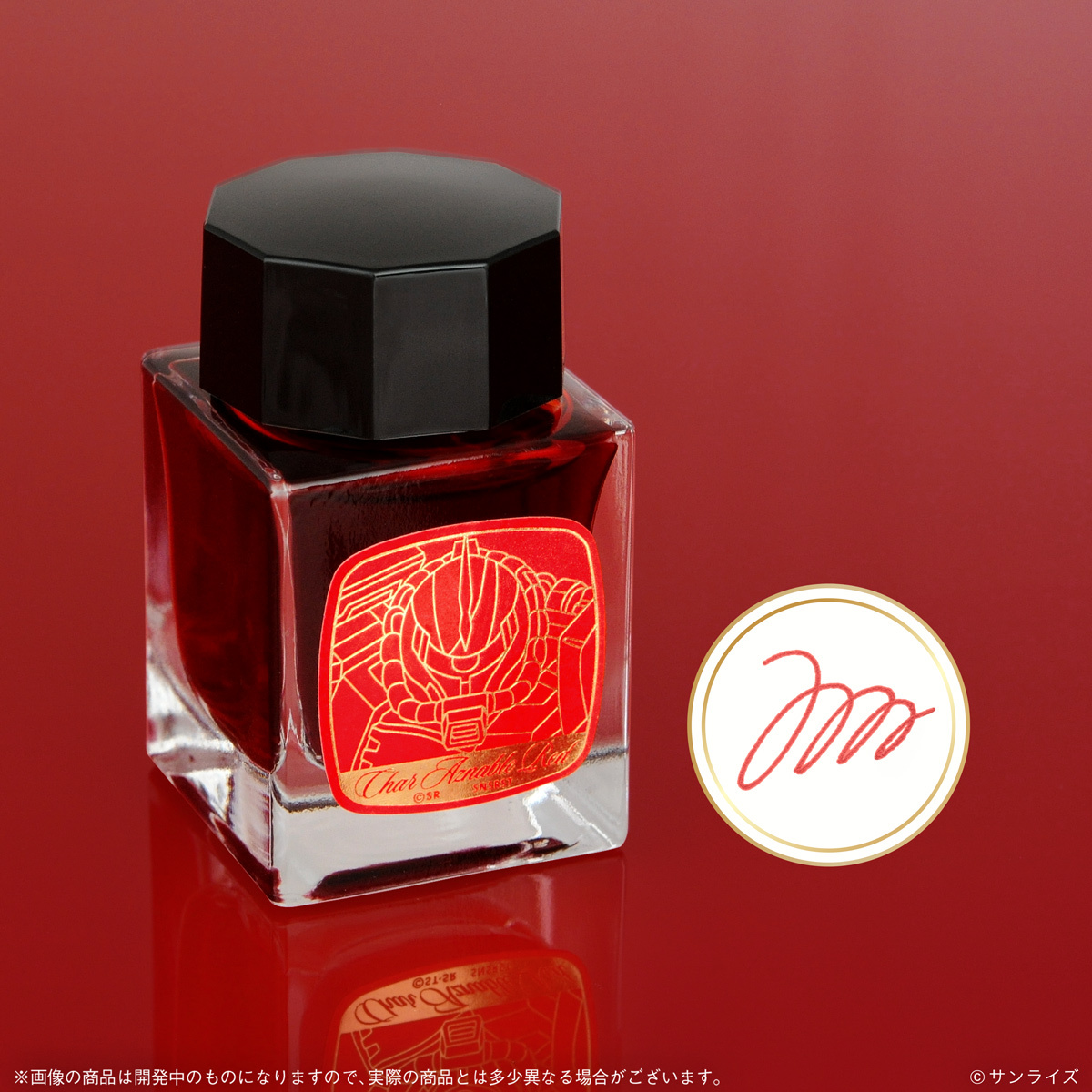付属のインクは専用に調合したオリジナルインクの「CHAR AZNABLE RED」、ラベルには金色の箔押しでシャア専用ザクIIをデザインした豪華仕様です。