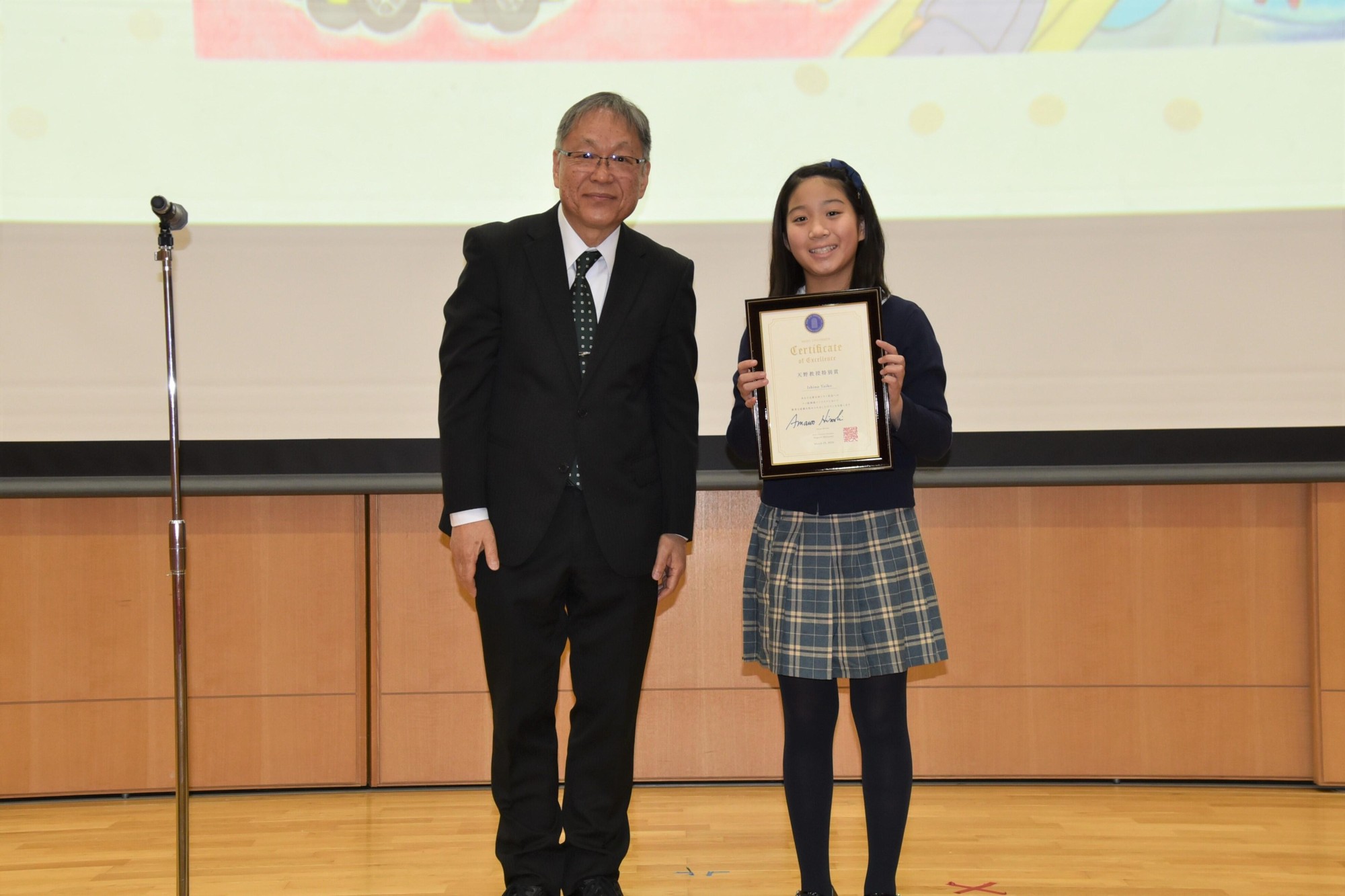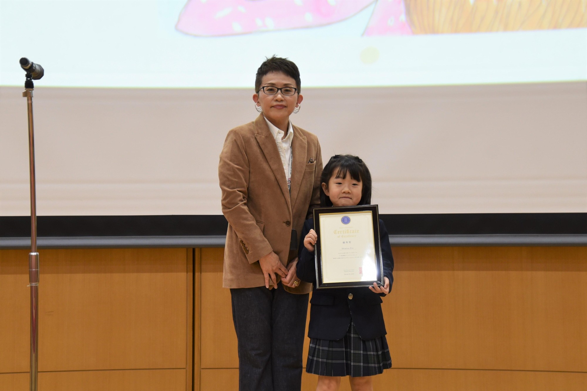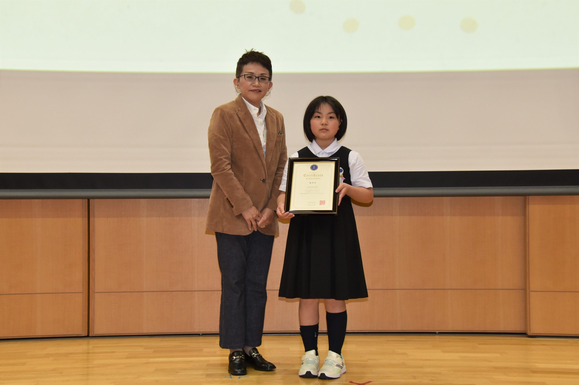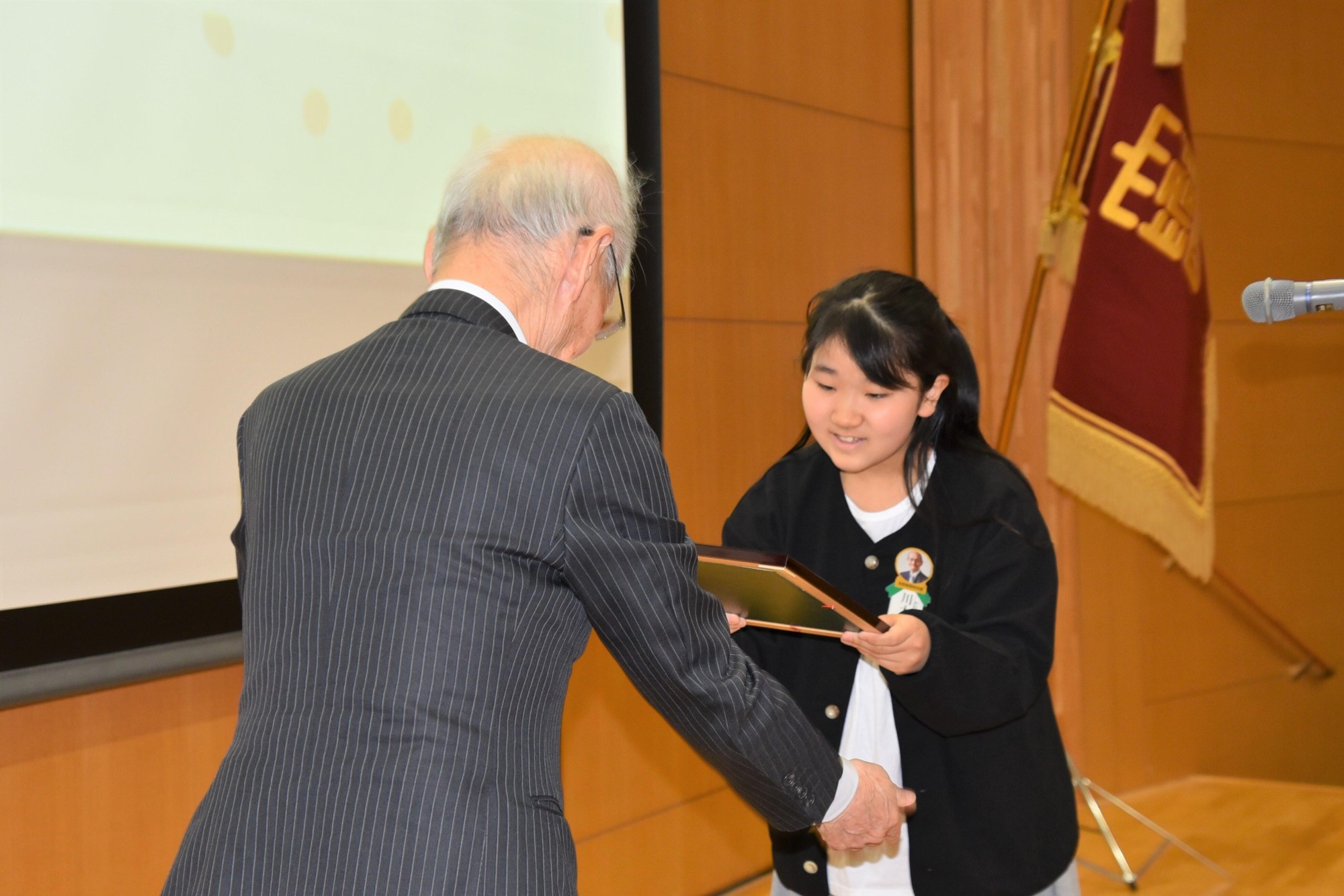表彰式では、初めに野口学長が「皆さんが描いてくれた『科学のふしぎ』は大切な『気づき』の第一歩です。これからも身の回りのことに目を向け、『なぜだろう』と考える気持ちを大切にしてほしいと思います」とあいさつ。吉野終身教授、野口学長、赤﨑特別栄誉教授の門下生の竹内哲也理工学部教授、伊深智美渉外部事務部長が受賞者1人1人に表彰状を渡しました。