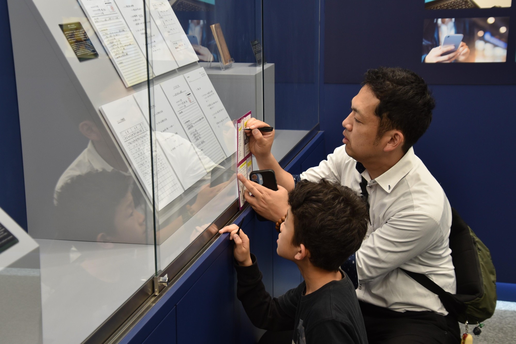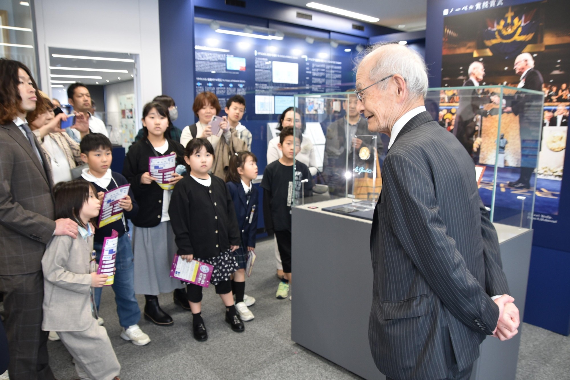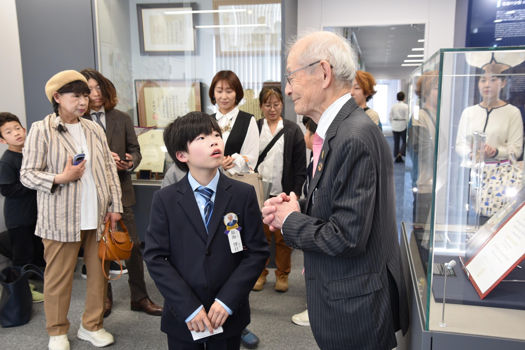 式の後、受賞者とその家族は応募作品を展示している天白キャンパス内の校友会館4階にある「赤﨑・天野・吉野ノーベル賞記念展示室」へ。吉野終身教授自らリチウムイオン電池の開発の経緯などを説明したり、ノーベル賞のメダルのレプリカの前で受賞者や保護者と記念撮影に収まったりしていました。質問も相次ぎ、「子どもの頃はどんな遊びをしていましたか?」との質問に、吉野終身教授は「セミ捕りやトンボ捕りで遊びました。自然の中で遊んだことで理系に進むことになったと思います」と答えていました。
