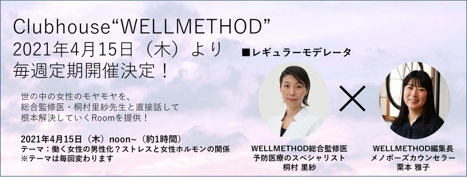 株式会社ダイセル(本社:大阪市北区)が運営する大人のウェルエイジング・ブランド「WELLMETHOD(R)(ウェルメソッド)」は、2021年3月に、音声アプリ「Clubhouse(クラブハウス)」においてクラブを開設し、WELLMETHODの編集長・栗本雅子ならびにWELLMETHOD監修医である桐村 里紗氏がモデレータをつとめるトークルームを2021年4月15日(木)より定期開催することといたしました。