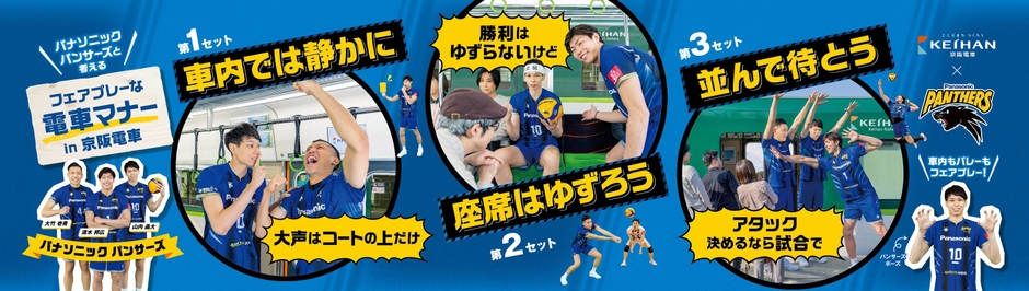 今回のシリーズでは、京阪ホールディングス株式会社とパナソニック株式会社が昨年9月にパートナーシップ協定を結んだことを機に、バレーボールチーム「パナソニック パンサーズ」の清水選手、山内選手、大竹選手が登場し、電車内でのマナーとバレーボールでのプレイの違いを対比しながら、マナー向上を呼びかけます。