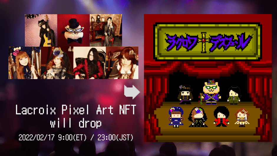 音楽活動の新しい形を提案するOffice Lacroix(オフィスラクロワ)合同会社(所在地:東京都国立市、社長兼CEO:天野 翔)のロックオペラバンドLacroix Despheres(ラクロワ・デスフェール)は、コロナ禍における新たな表現手法の一つとして、初となるNFTアート作品「Lacroix Pixel Art NFT」を、Spotifyプロフィールページと独自ECサイト「Lacroix Despheres Online Store」にて、2022年2月17日(木)23時に発売いたします。