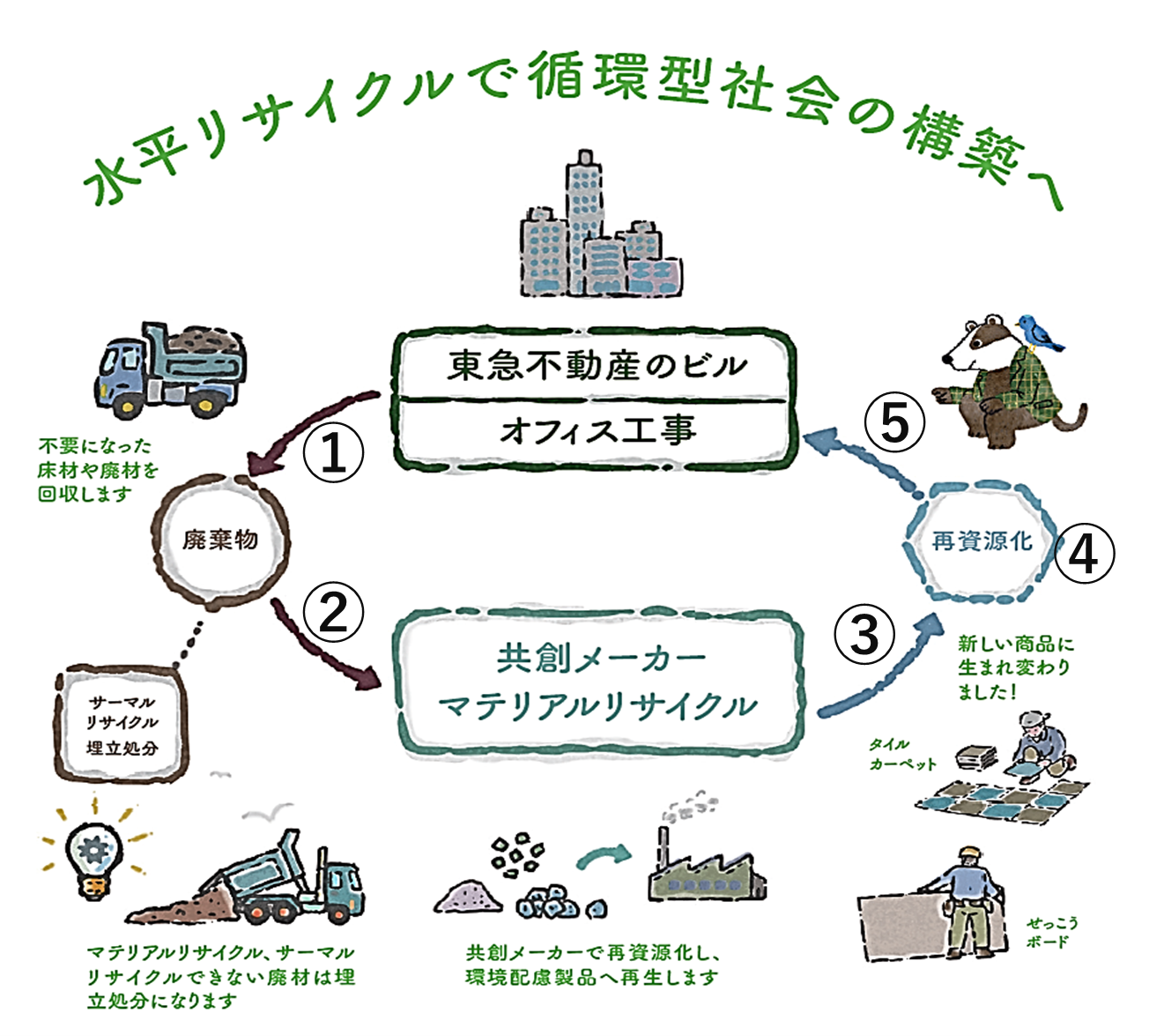 ⑤ 東急不動産が環境配慮型の再生内装建材を入居テナントの内装工事に提案し、その建材をテナントが採用