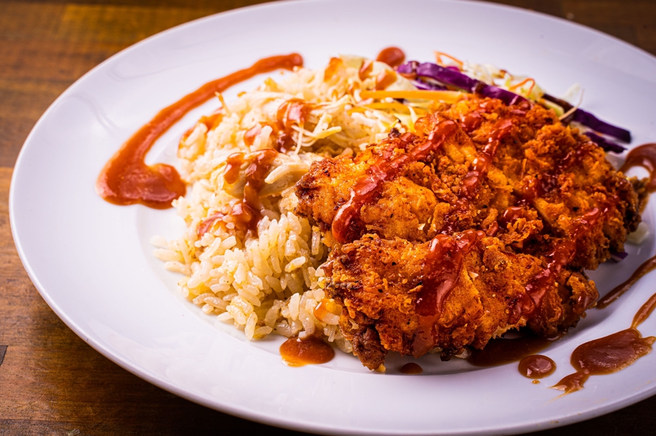 お米とフライドチキンをマッチさせるコクのあるBBQソース!ニューヨークの屋台では定番の一品。ハイカラフライドチキンでは、鶏のスープとフライドチキンで炊いたご飯の上に、たっぷりの野菜とスパイシーな骨なしフライドチキンを重ねました。日本人の味覚に合わせるため、本場で使われるヨーグルトソースではなく、新たにBBQソースを開発。このソースが「米とフライドチキン」という違和感がありそうな2つの食材を、まろやかにつなぎます。