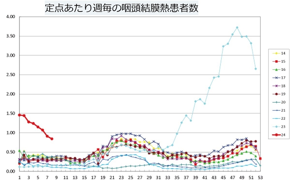 今年度は9月終わり頃(39週(9月25日~10月1日)あたり)から感染者数の報告が増加しています。典型的な溶連菌咽頭炎は、のどが真っ赤に腫れて強い痛みがあり、扁桃腺に膿がついたり、38℃-39℃の高熱が出ます。目は鼻や咽頭と繋がっていますので、軽く充血することもありピンクアイと呼ばれます。一般的には咳や鼻水などのかぜ症状は少ないですが、小さな子どもだと鼻水だけの軽い症状のこともあります。また、稀ではありますが、連鎖球菌性毒素ショック症候群、リウマチ熱や急性糸球体腎炎など、重症化したり合併症を起こすことがあります。溶連菌に感染していると判断されると、抗菌薬が処方されます。
