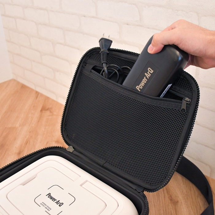 PowerArQ2に最適化されたサイズで、ACアダプターやMC4ケーブル、シガーケーブルなどの付属品も収納可能。PowerArQ2よりも小さなPowerArQ mini 2、 PowerArQ miniも格納することができます。