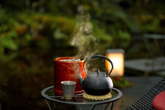 「星のや毬ごよみ」鑑賞中は、鉄瓶で沸かしたほうじ茶で身体を芯からあたためることができます。茶葉を発酵させてつくるほうじ茶は、カフェインが少なく血の巡りをよくするため、身体をリラックスさせながらあたためることができるお茶です*6。古くから、鉄瓶で水を沸かすことで、水の口あたりがまろやかになり鉄分を補うことができると言われています*7。手毬のやわらかな灯りを眺めながらほうじ茶を飲むことで、身も心もあたたまることができます。