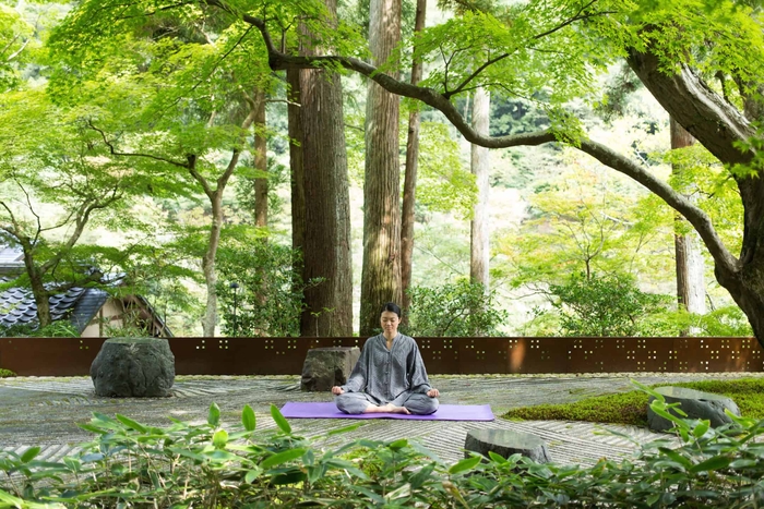 冬の凛とした空気のなか、星のや京都の「奥の庭」で呼吸法を重視したストレッチ「水辺の深呼吸」を行います。奥の庭は、燻(いぶ)し瓦と白石を砂(さ)紋(もん)に見立てた枯山水の風情の庭です。庭からは、星のや京都の目の前を流れる大堰(おおい)川(がわ)の流れや対岸の小倉山の木々を眺めることができます。奥の庭の開放感とともに深呼吸をしながら四肢を伸ばすことで、血が巡り、身体があたたまります。