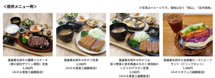 期間中、みのる食堂では国産黒毛和牛を使用した「ステーキ(希少部位ザブトン使用)定食(数量限定)」「牛かつ定食」、みのりカフェでは「ローストビーフサンド」を提供します。