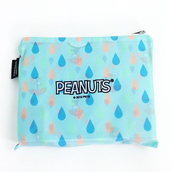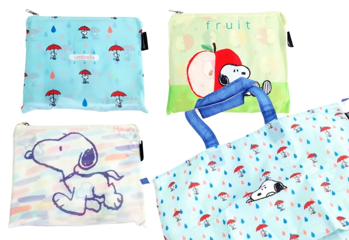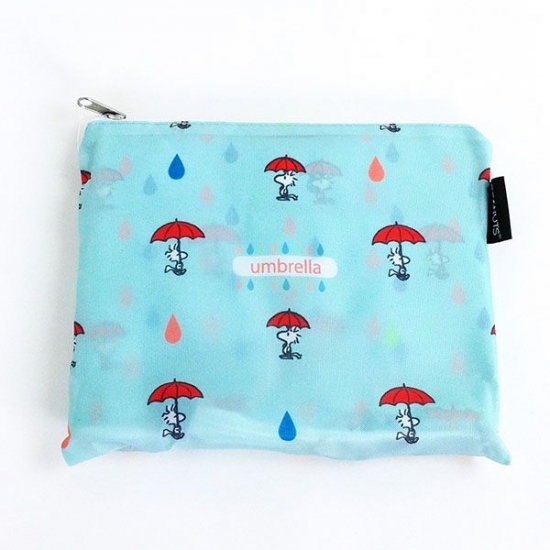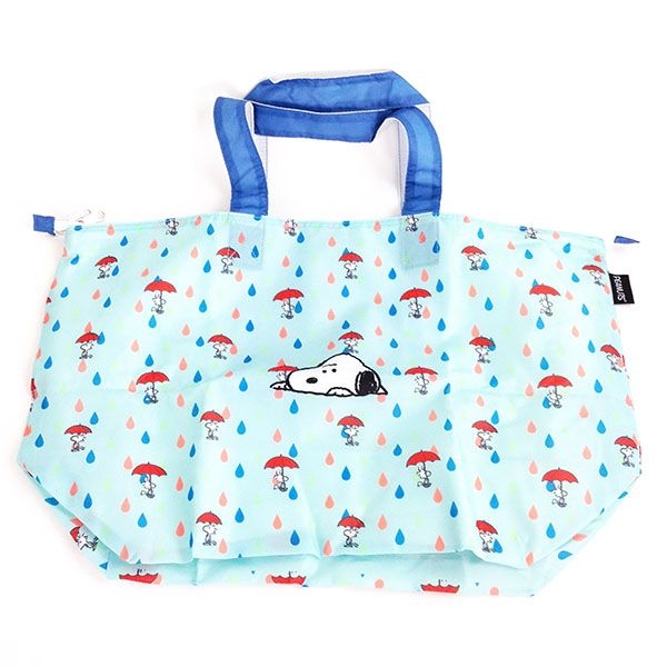 アンブレラ模様のマルシェバッグです。明るいブルー地に、傘をさしたウッドストックが大勢いますね。ドロップ模様もカラフルでキュートです。雨の日の買い物も、ハッピー気分になれそうです。