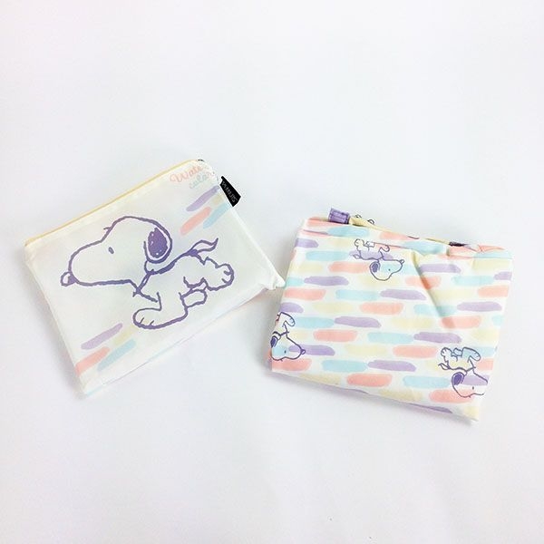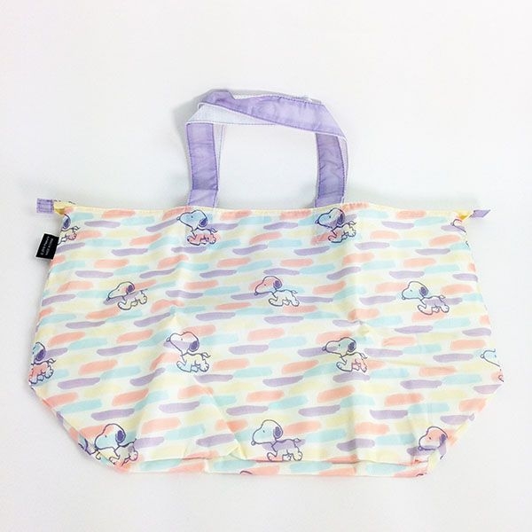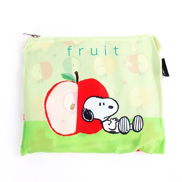 フルーツ柄のスヌーピーがキュートですね。アップルグリーンの爽やかなカラーもオススメです。ポリエステル素材なので、軽くて便利なんです。上の画像はポーチに収納した状態なので、常にバッグにインしておけば、急に荷物が増えた時にも安心です。