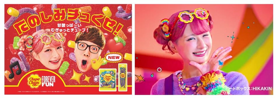 新CMでは、チュッパチャプスの楽しい世界感の中に、しなこさんがカラフルな衣装で登場。HIKAKINさんのビートボックスをBGMにしたポップで楽しいカラフルな世界で、見るとクセになるCMです。また、チュッパチャプスのグミを「たのしみチュくす」WEB動画では、しなこさんとHIKAKINさんがサワーチューブグミを使ってコーデチャレンジをするなど、思わず真似したくなる楽しい動画も公開いたします。