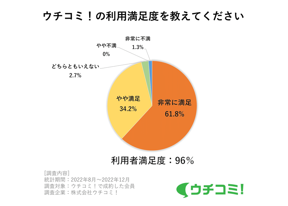 株式会社ウチコミ(本社:東京都新宿区、代表取締役:大友 健右)が運営する、大家さんが自ら入居者を募集する賃貸情報サイト「ウチコミ!」( https://uchicomi.com/ )は、「ウチコミ!」経由で引っ越しをした入居者に対して利用満足度調査を実施しました。2022年12月末時点の利用者満足度は96%でした。