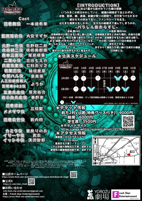 Fresh Star Entertainment(東京都板橋区)主催、『時空の観測者 ~過去と未来を繋ぐ者達~パラレル篇』が2024年7月13日 (土) ~2024年7月21日 (日)に萬劇場(東京都 豊島区 北大塚 2-32-22)にて上演されます。