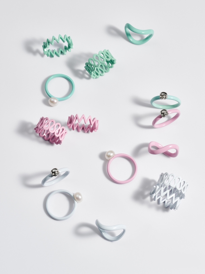 シルバー925をベースに、ニューシーズンらしいフレッシュなペールトーンカラーのリング・ピアスを展開。様々なラインを描くリズミカルなデザインと、ミルキーなペールトーンカラーの優しい艶感が新感覚なジュエリー。重ねてコーディネートして自分らしい手元の演出も可能です。