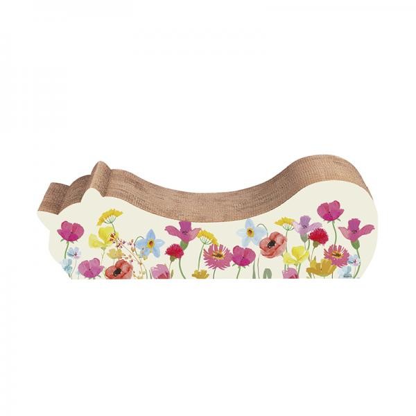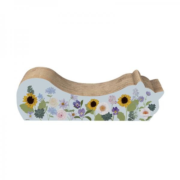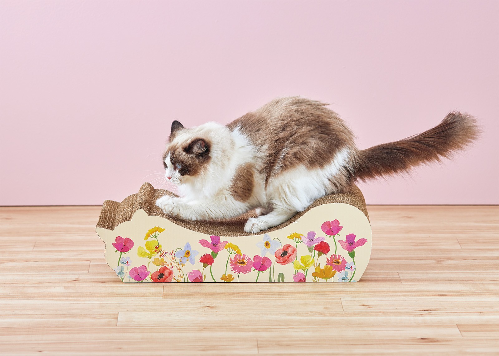 シリーズ累計販売数10万台を突破。猫が心置きなく爪とぎができる段ボールの素材と絶妙カーブフォルムの「ごろん猫の爪とぎ」に2026年の春夏限定柄が登場しました。お部屋を華やかに彩るフラワー柄は、2柄楽しめるリバーシブルデザインです。