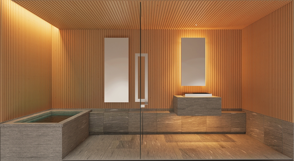 職人による精緻な技により、切り出しの石材ながら抜群の漏水性を備え、見た目にも肌触りにもやさしく美しく仕上げています。壁面・天井に配された縞目の面材には、水や湿度に強い檜の天然木を贅沢に使用、見た目や素材の特性だけでなく、耐久性やメンテナンスにも配慮した造りを実現しています。また、その壁面檜材が醸し出す陰影は、まさに日本の「美」感覚を映し出すデザインとなっています。スイス・アルプスのバルスストーンはレザー仕上げが施され、見た目にも美しく、また肌触りもやさしく仕上げられています。凸部材の張り合わせを排除し、一枚板から削り出しにより面材を形成しています。