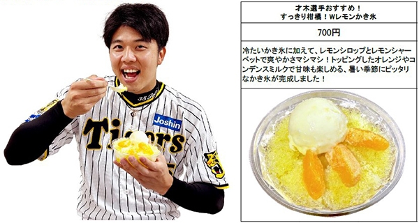 才木選手コメント「暑い夏でも体の芯まで冷んやりして気分爽快です!大好きなかき氷に、普段からよく食べるオレンジをトッピングしてレモン風味でさっぱり仕上げました!これを食べて野球観戦も楽しんでもらえたら嬉しいです!」