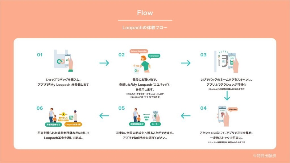 従来のLoopachを使用したお買い物時にバッグにインセンティブ・ポイントが貯まり、ユーザーが寄付先リストより選んだ団体にギフト(1pt=0.5円~)として送ることができる機能はそのままに、社会課題などと接点が少なかった方々にも、楽しみながら自然と考えるきっかけを持っていただける機能として期待しています。