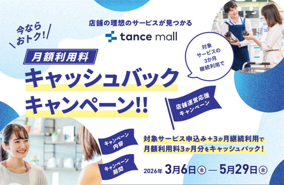 tance株式会社(所在地:東京都新宿区、代表取締役社長:中井 和寛)は、店舗向けプラットフォーム「tance mall」にて、対象サービスの新規申込と3か月継続利用で月額利用料3か月分をキャッシュバックするキャンペーンを、2026年3月6日(金)から5月29日(金)まで実施します。
