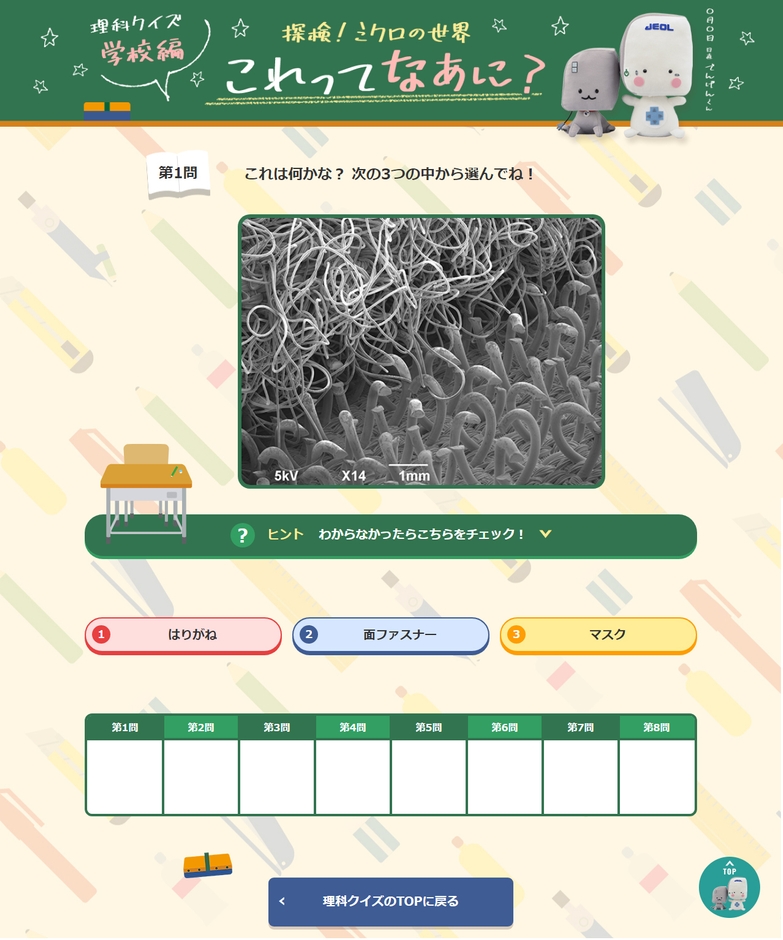 日本電子 理科教育支援のコンテンツ 「理科クイズ」を7月20日に公開。夏休みに挑戦してみよう! 「探検!ミクロの世界 ~学校編~ -これってなあに?- クイズ」