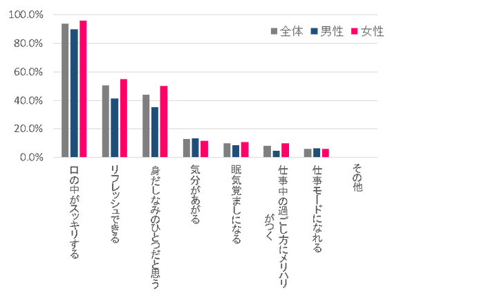 参加者が「昼歯みがき」に期待していることは、「むし歯予防」「口臭予防」が中心でしたが、「昼歯みがき」を行うと「口の中がスッキリする」「リフレッシュできる」などと実感していることがわかりました。また、「身だしなみのひとつだと思う」という回答も多く、「昼歯みがき」は、自分自身の快適さのためであると同時に、職場では、周囲の人への気配りを示すことにもつながっていることがわかりました。