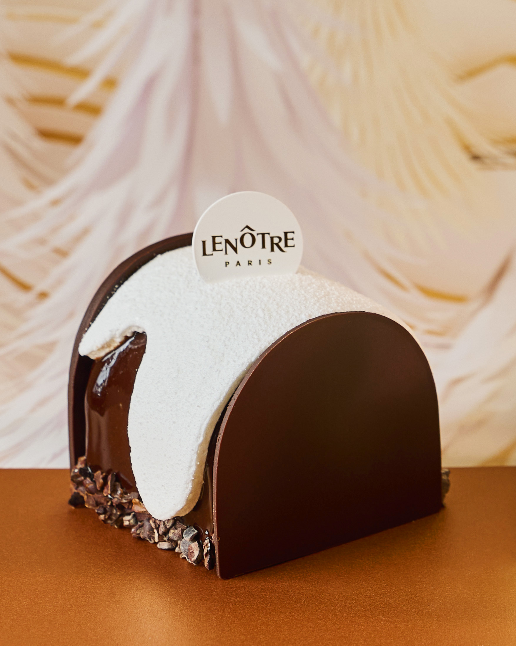 カカオ70%チョコレートとキャラメルのムース、軽やかなミルクチョコレートムース、カカオシロップを含ませたしっとりとしたビスキュイ・ショコラ、2種類のナッツを使用したチョコレートクランチなど、7層を重ねました。ギモーブで雪化粧したクリスマス限定のケーキをお楽しみください。