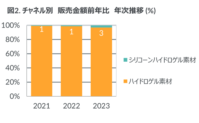 眼の健康に良いとされる、シリコーンハイドロゲル素材の新製品発売が続いている。従来のハイドロゲル素材よりもプレミアムな素材・価格としてクリアレンズでは一般的な素材となっているが、カラー・サークルレンズ市場ではまだその規模は小さく、製品数も少ない。一方で、人気製品シリーズから新たにシリコーンハイドロゲル素材のタイプが発売されるなど、製品のラインナップ拡大の動きが見られている。素材別の金額構成比を見ると、ハイドロゲル素材が主流であることは変わらないが、徐々にシリコーンハイドロゲル素材の構成比が増加している(図2)。カラー・サークルレンズにおいても定着していくのか今後が注目される。