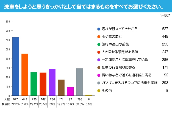 データバンク株式会社のWash Pass利用者への独自調査でも、洗車をしようと思うきっかけは、7割以上の方が「汚れが目立ってきたから」と回答。