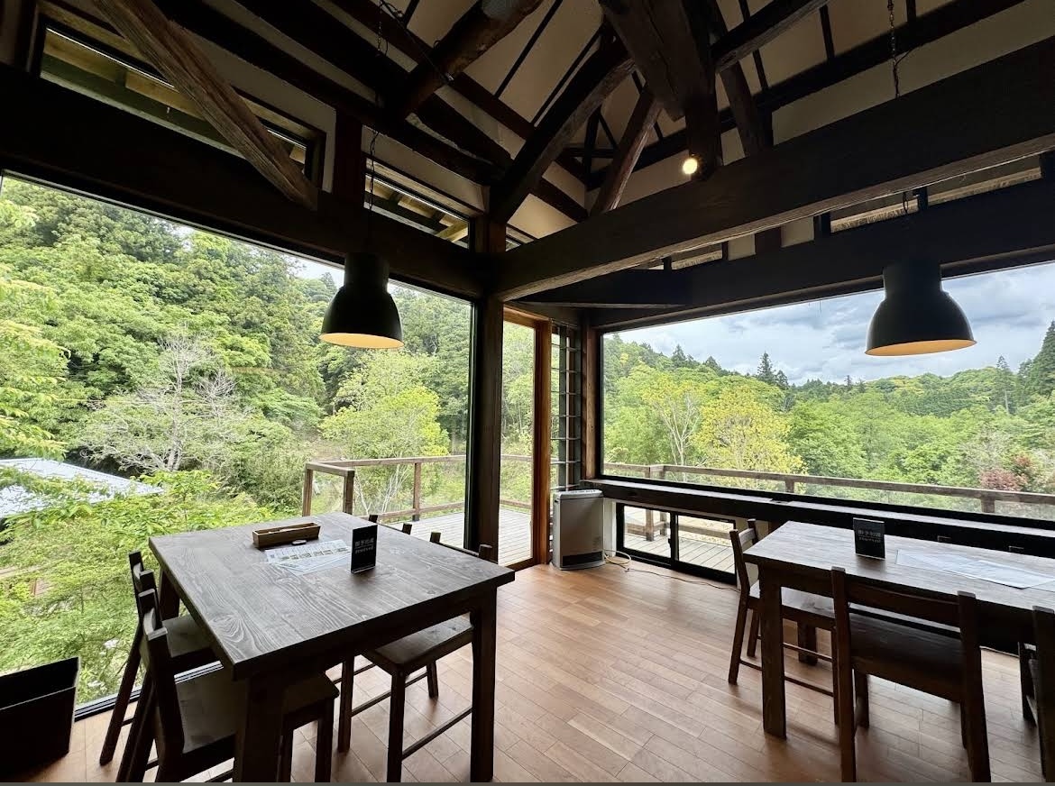 高滝駅から約1.5kmのところにある「Muirhead Fields BLU LEAF」は、宿泊施設や飲食店が集まる注目のスポット。中でも築約200年の古民家を改装し、2024(令和6)年にオープンした「FARMER'S TABLE Grill & Steam」は、自社農園で採れた野菜を中心としたメニューが人気のレストランです。50席以上ある広々とした店内の一部では、愛犬と一緒に食事が楽しめるのも魅力。歴史ある建物の温もりを感じながら、ゆったりと過ごすことができます。