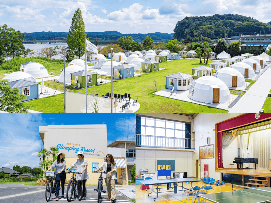 2021(令和3)年にオープンした「高滝湖グランピングリゾート」は、廃校となった高滝小学校をリノベーションした、若者やファミリーに人気の施設。元学校ならではのワクワクする仕掛けが満載で、敷地内にある体育館やプレイルームでは、天候を気にせずトランポリンや卓球などで思い切り体を動かすことができます。夜間はキャンプファイヤーや手持ち花火のほか、理科室などでの肝試しのオプションも!自転車をレンタルして、自然豊かな高滝湖周辺を散策するのもおすすめです。グランピング初心者でも快適に過ごせるよう、エアコン完備のドームテントに宿泊に必要な備品が揃っているのはもちろん、貸切風呂などの設備も充実。県産食材にこだわった本格BBQ付きプランもあり、手ぶらで気軽にアウトドアを満喫できます。