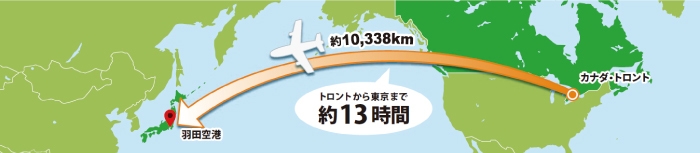 カナダの国土はロシアに次いで2番目の大きさで、その面積は日本の26.4倍に相当します。その中でトロントはカナダで最も人口が多い都市(都市圏で約590万人)です。日本までは約1万km。直行便で約13時間かかります。