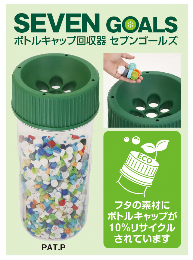 また、スーパーメイトでは再生製品の開発にとどまらず、回収の入口づくりにも取り組んでいます。2024年には、ペットボトルキャップを資源として分別回収する専用回収器「SEVEN GOALS(セブンゴールズ)」を発売しました。1台あたり約2,800個のペットボトルキャップを回収可能です。