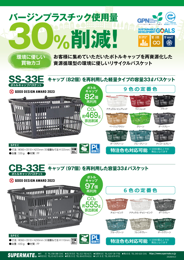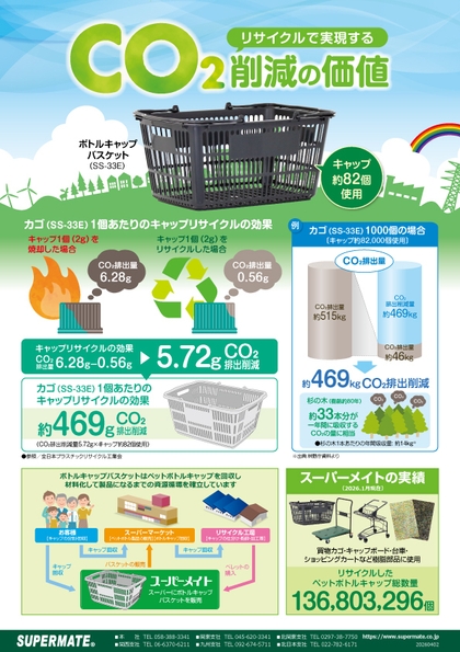 株式会社スーパーメイトは、廃棄されていたペットボトルキャップを再資源化し、買い物カゴをはじめとする製品へ再生利用する取り組みを推進しています。2026年4月10日時点で、ボトルキャップバスケットの累計生産数は1,723,113個、再利用したペットボトルキャップは142,449,287個に達しました。