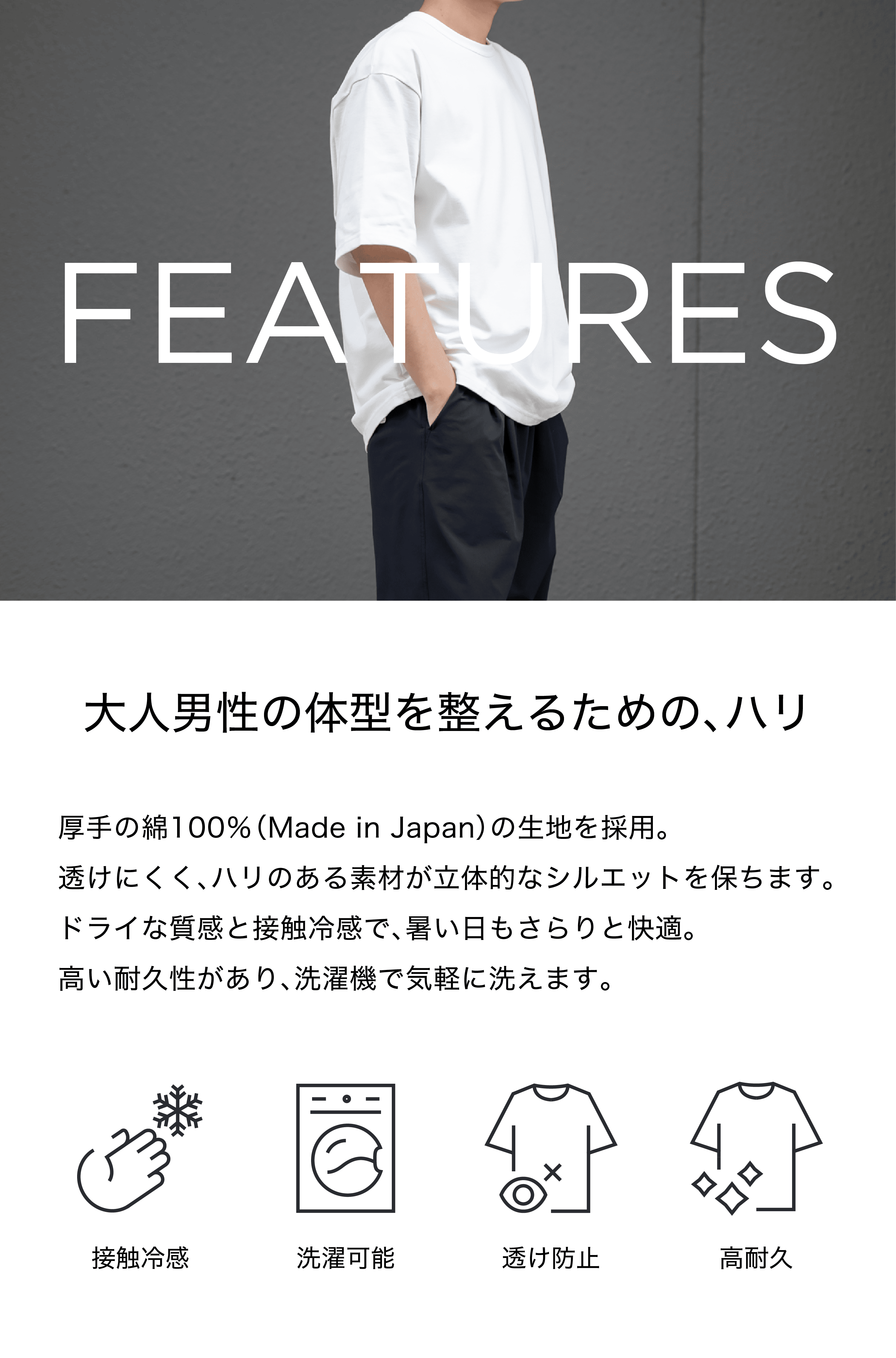 「体型悩みに向き合う機能性」と「毎日着たくなる快適性」を両立した、大人のためのTシャツです。