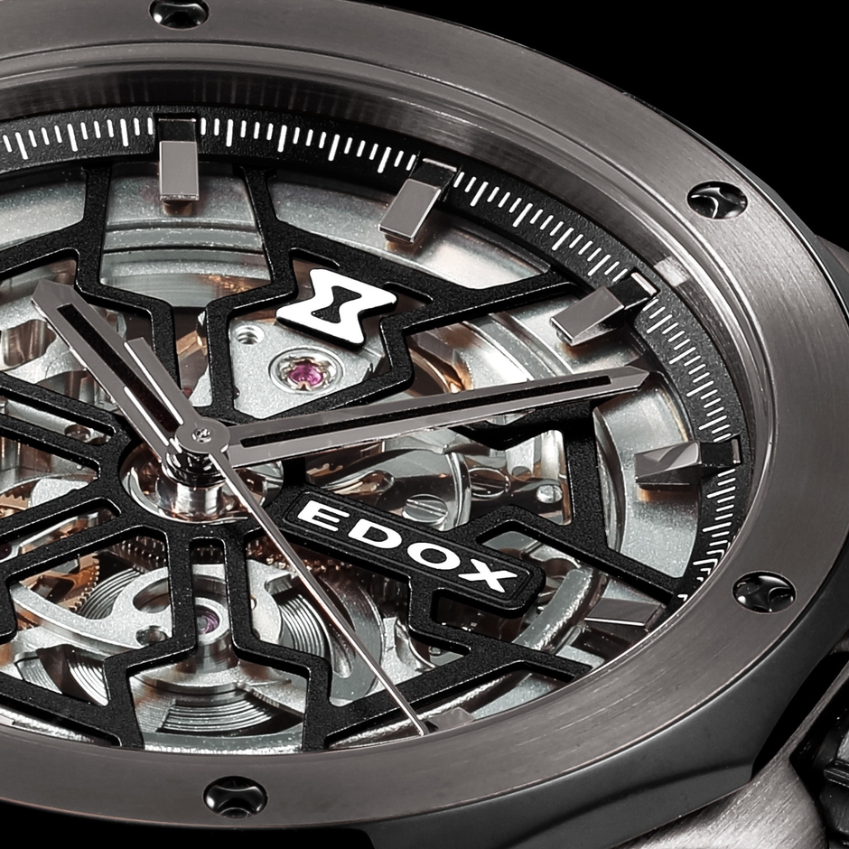 スケルトンウォッチの最大の特徴と魅力は、時計内部の構造が視認できることに尽きます。『デルフィン メカノ オートマティック』に搭載された自動巻きムーブメントEDOX キャリバー853は、テンプの繊細な動きや香箱の一部をくり抜いて巻上げゼンマイの動きを見せるなど、繊細な工夫が細部に至るまで施されています。コンテンポラリーな雰囲気を纏うダイアルのカットワークは、エドックスのブランドエンブレムである“砂時計”を再解釈しデザインされました。美しいカットワークアートと精巧なムーブメントの動きを、心ゆくまで鑑賞することができます。