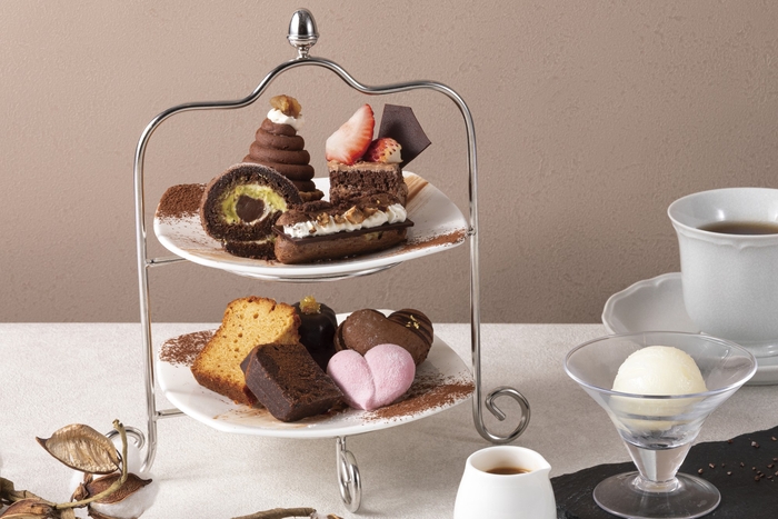 おひとり様につき1台ご提供のデザートスタンドは、スイーツごとに最適なチョコレートを選び分けて仕立てたチョコレートスイーツが勢ぞろい。マロンクリームに酸味とフルーティーさを併せ持つコクのあるドミニカ産カカオを使用した「モンブランショコラマロン」をはじめ、ナッツの香りが香ばしいクーベルチュールチョコレートを挟んだ「エクレアショコラ」や、しっとり食感の中にほんのりと柑橘香る「テリーヌショコラ」、なめらかなミルクチョコレートとピスタチオ風味の純生クリームをくちどけの良いショコラロール生地で包んだ「生チョコロールケーキ」などのチョコレートスイーツをお楽しみいただけます。
